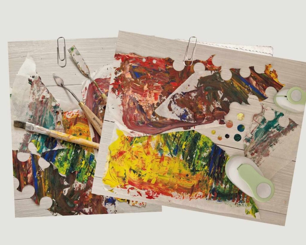Zusätzlich liebe ich es, Collagen aus bunten, selbst gefärbten Papieren zu gestalten. Ich färbe die Papiere spontan mit Acrylfarbe, die ich entweder dick oder lasierend auftrage. Dabei setze ich Malmesser und Pinsel ein, um interessante Texturen zu erzeugen. Nach dem Trocknen der Papiere stanze ich runde oder quadratische Formen aus, die ich anschließend gefühlsmäßig in meine Bilder wie kleine Mosaike einklebe. Ich frage mich häufig, welche Meinung Niki de Saint Phalle, die sich sehr gut mit Mosaiken auskannte, dazu äußern würde.