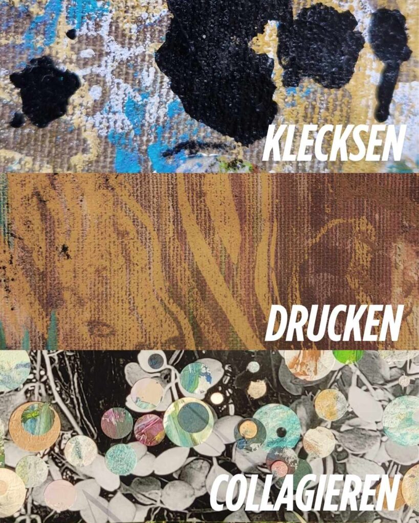 Die experimentellen Techniken des Klecksens, Druckens und Collagierens wiederhole ich beliebig oft.